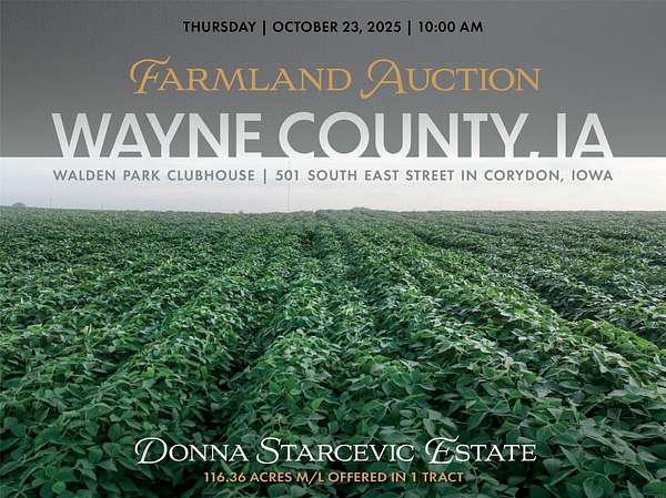 Wayne County, Iowa Land Auction - Mark your calendar for Thursday, October 23rd, 2025, at 10:00 AM! We are pleased to be representing the Donna Starcevic Estate in the sale of 116.36 acres m/l located one mile south of Allerton, Iowa. This high-quality Wayne County, Iowa farm consists of 108.83 FSA cropland acres of Highly Erodible Land with a CSR2 soil rating of 53.6. Primary soil types include Seymour silty loam and Clarinda silty clay loam. The farm lease for 2025 has been terminated, and the farming rights are available for the 2026 crop season. Located on the east side of County Road S26 in Section 14 of Warren Township, Crawford County, Iowa, this farm would make a great add-on to an existing farming operation or an investment for the Buyer looking to diversify their portfolio. Located in an ideal location with paved access off of County Road S26 and near State Highway 2, US Highway 65, and State Highway 14, with a number of accessible grain markets nearby. The single tract will be offered on a price-per-acre basis via Public Auction and will take place on Thursday, October 23rd, 2025, at 10:00 AM in the Walden Park Clubhouse at the Corydon Golf Course in Corydon, Iowa. This auction can also be viewed through a Virtual Online Auction option, and online bidding will be available. Visit our website for more information regarding this Auction.