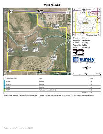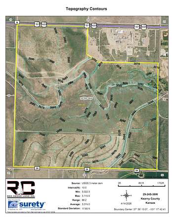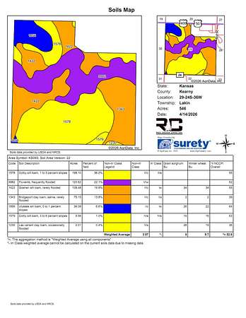 Legals: S29, T24, R36W, ACRES 546.31, NW 1/4, S 1/2, & S 1/2 NE 1/4 LESS CO RD, HWY ROW, & AMAZON DITCH Parcel I.D- 0471592900000002000 Driving Directions: From Lakin, Kansas travel 2 miles west on Highway 50, the property is on the south side of the highway. 2025 Taxes: $387.90 Property Description: Just west of Lakin this 546+/- acre property offers a mix of dryland farming and pasture. The access is directly off of U.S Highway 50. The Sand Creek draw divides the property, on the north side there is roughly 103+/- acres of dryland tillable and 257+/- acres of native grasses, ideal for grazing. South of the draw there is an additional 176+/- acres of productive dryland tillable acres. This property is a mix of Colby and Ulysses silt loam along with Bridgeport clay loam soils. With convenient access from Highway 50 on the north side, County Road 140 to the south, and neighboring a local golf course to the east, this property presents a solid opportunity for anyone looking to invest in a versatile combination farm. The Seller is retaining their mineral rights. There is a long term lease with Lakin City Golf Course for hole #3.