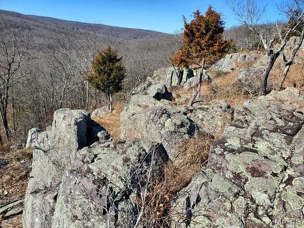 This very private 45 acre setting has spectacular views throughout the entire property. All of the acreage is south facing with mature timber and large scenic rocky glades. There is a small wet-weather creek that runs through the property. Sunny exposure makes solar an easy option, electric is available at the county road. The birds and wildflowers are a nature-lovers dream.