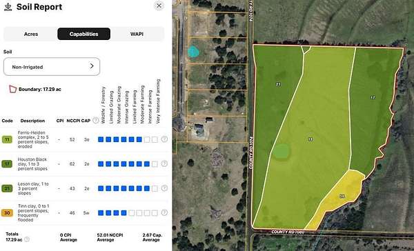 Dual road frontage on County Road 1074 and County Road 1080, offers multiple access points and flexible site planning. Enter through the gate on CR 1074, find a loafing shed, scattered trees, and multiple build sites overlooking a pond. Houston and Leson soils support grazing and agricultural use. Enjoy the season creek at the rear.