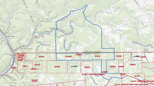 Introducing a remarkable opportunity to own a 2167-acre ranch in Lampasas County. The property has moderate elevation changes with beautiful, rolling topography boasting panoramic views of the hill country from several areas of the ranch. The perimeter is a high fenced perimeter and is home to native wildlife including a large population of whitetail deer, Rio Grande Turkey, feral hogs, Black Buck Antelope, Alpacas and more. The property boasts a live water creek (Yancey Creek) with several seasonal creeks allowing options for future tank or lake installations. The property has many upgrades including a high fenced perimeter, interior caliches roads, concrete culverts at low water crossings, concrete dam in place on Yancey Creek, multiple water wells, and easily accessible electric service. Agricultural exemption is in place so you can take advantage of the significant tax breaks offered by the exemption. The land features include native grasses, rock outcroppings, scenic bluffs along the live water creek of Yancey Creek and several species of native hardwoods including live oaks, juniper, ashe and mesquites. If you are looking for that special "hill country" recreational place boasting live water features and beautiful vistas, a managed hunting ranch, a working a cattle ranch, or as an investment property, then The Bluffs at Yancey Creek is a must see! The property can be purchased as a whole for $12,500 per acre or can be divided into 300-500 acre parcels for $15,000 per acre.