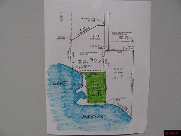 Est $2,067/moHere it is, your own private retreat on beautiful Lake Hanska! This 4.70 acre lot is situated at the end of a long private driveway! There are gorgeous views of the lake on the south and west sides of the lot. The lot is level with a nice sandy beach. If you've been looking for a lake lot, you know you won't find many the size of this one and with the privacy this lot offers! Give me a call today for more information and your own private showing!