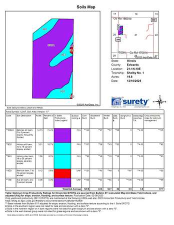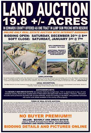 The BEVERLY ANN DREVS ESTATE land auction featuring a single tract, 19.8 +/- taxed acres in size, of rural Edwards County, Illinois land, located west of West Salem and east of Mt. Erie in Shelby 1 Precinct. The parcel includes some productive farmland with income potential, woods for hunting or recreation, and potential homesites with some rural utilities available in the vicinity of the property. Call Dustin to schedule a guided tour!