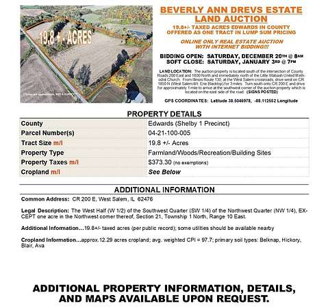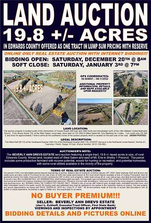 Est $441/moThe BEVERLY ANN DREVS ESTATE land auction featuring a single tract, 19.8 +/- taxed acres in size, of rural Edwards County, Illinois land, located west of West Salem and east of Mt. Erie in Shelby 1 Precinct. The parcel includes some productive farmland with income potential, woods for hunting or recreation, and potential homesites with some rural utilities available in the vicinity of the property. Call Dustin to schedule a guided tour!