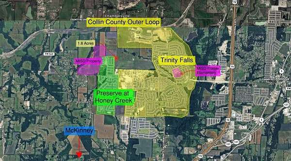 This is one of the last available estate sized parcels in this part of McKinney, offering a rare chance to secure a prime piece of land in a growing area. This 1.8-acre lot is cleared, level, and ready for a custom home or potential development. Located near Trinity Falls and the Preserve at Honey Creek, the lot sits among several growing residential communities, reflecting steady growth in the area.
