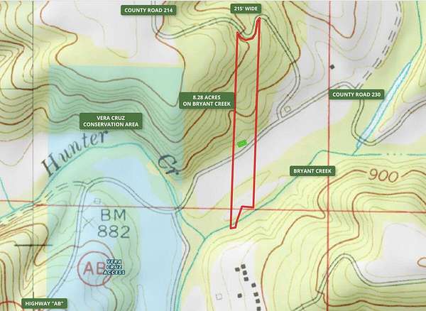 Rare Bryant Creek frontage near Ava, MO! This unique Ozarks property offers over 200 feet of direct frontage on Bryant Creek, one of the most popular streams in the region for fishing, floating, and canoeing--frontage like this is extremely hard to find. The land is located just 1/8 mile from the Vera Cruz Conservation Area, providing easy access to public hunting, recreation, and campsites. The property features county road frontage on CR 230 and CR 214, electric and phone available, open meadow areas, and big mature timber. The south side of CR 230 is mostly flat and borders Bryant Creek (located in a flood zone typical of creek-bottom ground), while the north side rises and then levels out, offering excellent building sites outside the flood zone with scenic Ozark views. A standout feature is the historic rock barn, believed to have once served as the post office and general store for the former town of Vera Cruz over 100 years ago--an incredible restoration opportunity. The property is centrally located in the Missouri Ozarks, just over one hour from Springfield, with over 10,000 acres of nearby National Forest for hunting, camping, and trail riding. Protective covenants apply (no mobile homes; minimum 600 sq ft concrete foundation for residences or cabins). A rare opportunity to own creek frontage, history, and prime Ozarks land all in one tract.