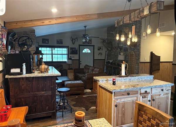 South Texas ranch retreat on 122+/- acres in Encino, Texas. This fully low-fenced property offers excellent hunting opportunities for white-tailed deer, hogs, and dove. The ranch features water lines running throughout the property, feeders in place, a water well, solar-generated power, satellite service, security system, and cameras, creating a well-equipped setup for recreation, hunting, or weekend use. Improvements include a ranch-style home/lodge with a warm, rustic interior and comfortable living space, along with a covered outdoor entertainment pavilion perfect for gatherings and parties, complete with space for seating and a TV area. Whether you are looking for a private getaway, hunting property, or long-term land investment, this ranch offers a strong combination of usability, wildlife appeal, and South Texas ranch living.