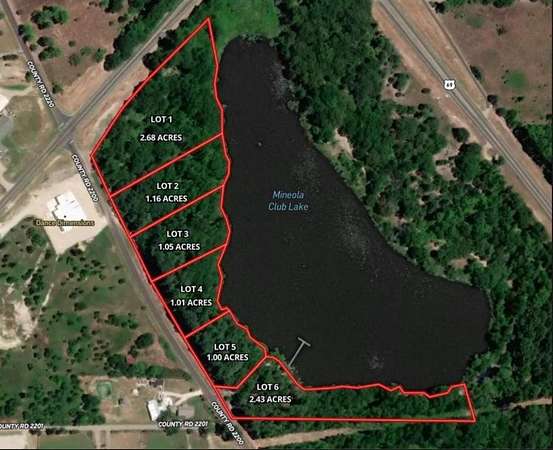 Welcome to your slice of paradise! This beautiful 2.68 acre lakefront lot offers breathtaking views overlooking a serene private lake in charming Mineola, Texas. Imagine enjoying peaceful mornings on your back porch, sipping coffee as the sun rises over the water and evenings spent fishing, relaxing, or watching the ducks that flock to the lake in the fall and winter. This property is perfect for nature lovers, with towering pines and abundant wildlife right in your backyard. The lake is fully stocked, and there's plenty of space to build your own dock, ideal for fishing with the kids or simply soaking in the beautiful lake views. Bring your own builder and design the lake retreat of your dreams! With a minimum build requirement of just 1,500 sq ft and no timeline to build, this lot offers both flexibility and freedom to move at your own pace whether you're planning a weekend getaway, future retirement home, or permanent residence. Located just 3 minutes from Mineola Country Club's golf course, brand-new clubhouse, restaurant, and bar, as well as only 5 minutes to Mineola's thriving downtown. Explore local restaurants, coffee shops, boutique shopping, and small-town charm that makes this area one of East Texas' hidden gems. Walmart & Brookshires within 5min as well as Mineola High school and the Brand new Mineola Middle school. Don't miss this opportunity to own lakefront property in one of Texas' most inviting communities!
