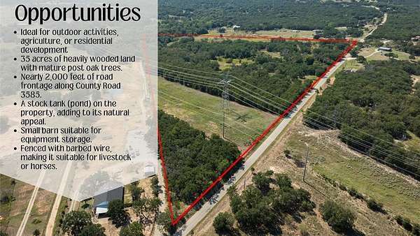 Est $5,461/moAlmost 2,000 feet of road frontage. The 35+ acres is heavily treed with mature post oaks and one stock tank. There is also a small barn that can be used to store small equipment. Walnut Creek Co-Op water is located along County Road 3585.