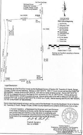 Commence at a Fat Pine Knot knows as the Northeast Corner of Section 36, Township 21 North, Range 13 East, Chilton County Alabama; thence run S01 degrees 35'07"E, 1991.11' to an iron pin set and the POINT OF BEGINNING:thence continue S01 degrees 35'07"E, 1331.95'.