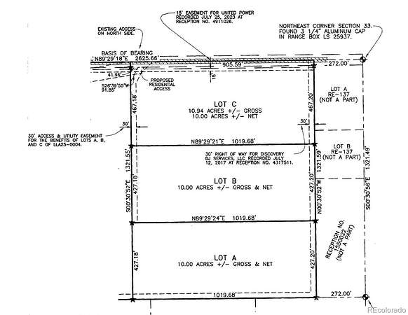 LOT C, LOT LINE ADJUSTMENT LLA25-0004, BEING A PART OF THE NORTH 1/2 OF THE NORTHEAST 1/4 OF SECTION 33, TOWNSHIP 1 NORTH, RANGE 66 WEST OF THE 6TH PRINCIPAL MERIDIAN, MORE PARTICULARLY DESCRIBED AS FOLLOWS: COMMENCING AT THE NORTHEAST CORNER OF SAID NORTH 1/2; THENCE COINCIDENT WITH THE NORTH LINE OF SAID NORTH 1/2 SOUTH 89°29'18" WEST, A DISTANCE OF 272.00 FEET TO THE POINT OF BEGINNING; THENCE COINCIDENT WITH THE WEST LINE OF LOTS A AND B OF RECORDED EXEMPTION NO. 1471-33-1 RE-137 RECORDED MAY 16, 1974 AT RECEPTION NO. 1636706 SOUTH 00°30'52" EAST, A DISTANCE OF 467.20 FEET; THENCE SOUTH 89°29'21" WEST, A DISTANCE OF 1019.68 FEET; THENCE NORTH 00°30'52" WEST, A DISTANCE OF 467.18 FEET TO THE NORTH LINE OF SAID NORTH 1/2; THENCE COINCIDENT WITH SAID NORTH LINE NORTH 89°29'18" EAST, A DISTANCE OF 1019.68 FEET TO THE POINT OF BEGINNING, CONTIAINING 10.94 ACERS, MORE OR LESS, COUNTY OF WELD, STATE OF COLORADO.