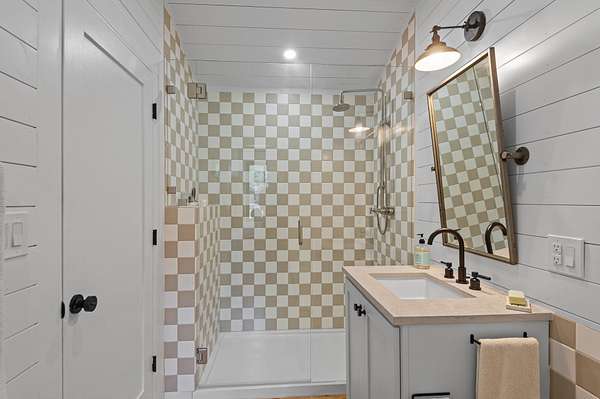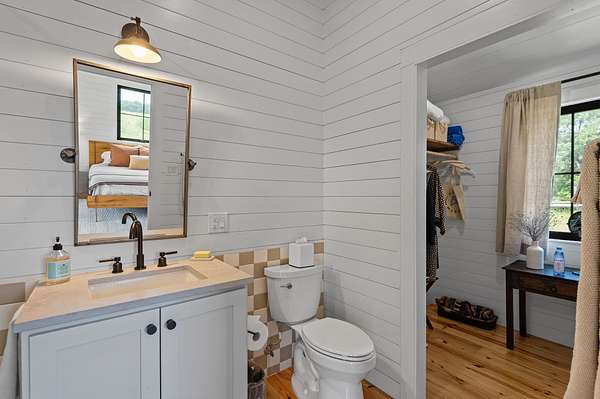 Originally remodeled in 1986, the 3-bedroom, 2.5-bath main home blends charm with functionality. Features include hand-painted cabinets, curated decor, and an oversized screened porch that overlooks lush gardens and a fire pit. Towering oaks provide shade and serenity, with one hosting a whimsical treehouse.