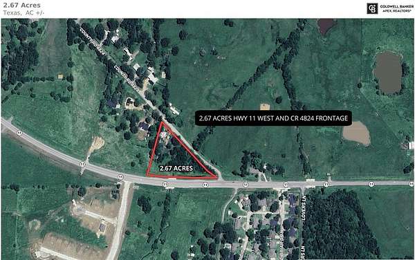 Discover a unique investment gem nestled in the heart of Sulphur Springs, TX--a property with fantastic development potential! Spanning 2.67 unrestricted acres, this versatile land offers a prime opportunity for innovative builders and savvy investors. Prominently positioned with frontage on Hwy 11 West and CR 4824, its strategic location promises future growth amid a burgeoning residential area.