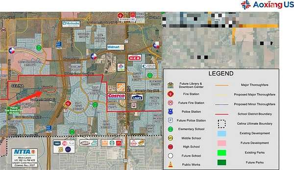 Est $32,735/moExceptional +-33.62 acres in the high-growth corridor of Celina, located just 0.9 miles from the Dallas North Tollway (Phase 4A under construction) and the 500' ROW Outer Loop. Currently zoned AG. Check Celina's ETJ and EDC map; the property is surrounded by major PDs, MF-2, and commercial zoning tracts, making it a strong candidate for mixed-use, multifamily, or phased residential development. The land is partially located in Zone A (floodplain) near the seasonal creek. Located within Prosper ISD, just minutes from Light Farms, The Columns, and several entitled multifamily communities. Power available via CoServ Oncor. Excellent long-term upside and infrastructure positioning.