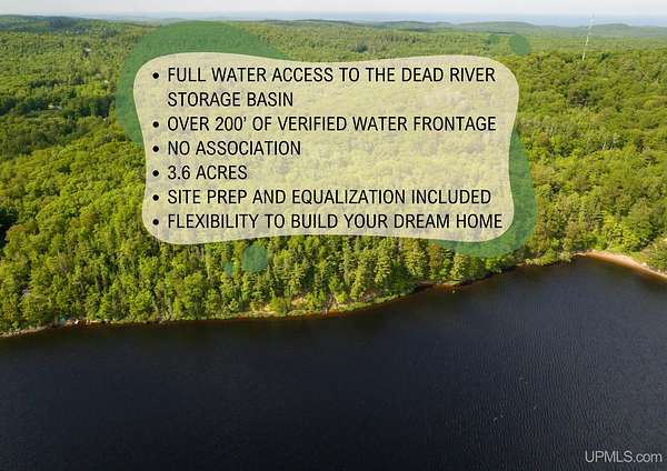 Rare opportunity to own a premium 3.6-acre waterfront lot with 247 feet of direct frontage on the coveted Dead River Storage Basin. Verified by a professional survey, this property gives you full access all the way to the water's edge. Unlike much of the property around the basin, this property is NOT part of the Dead River Campers Association, meaning no restrictive covenants--just freedom to design and build your dream home your way (township requirements still apply). Seller is covering full building site development, including professional land clearing, site prep for your future home or cabin, and grading the lots to create better accessibility to the water. Buy now and be part of the process! If purchased during development, you'll have the opportunity to work directly with the site crew to help shape your ideal layout. Set in a quiet, natural setting with a view toward open space and water, this property offers both privacy and convenience--just 10 minutes from Marquette and Negaunee. With electric and fiber optic available at the road, you'll have the modern conveniences to match the rustic beauty. Don't miss this rare combination of secluded waterfront, no association restrictions, and ready-to-build site prep. Schedule your visit and start picturing your perfect Upper Peninsula retreat today!