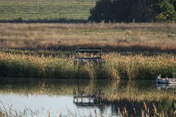 The 5.4 acre pond is only a few feet deep, offering excellent feeding and loafing water for ducks and geese. The pond level stays full throughout the year. Periodical maintenance of the pond and surrounding marsh land is approved by the conservation easement, allowing for habitat and pond improvements. There is a small shed located between the pond and the pivot base, but no other buildings besides the hunting blinds exist. The conservation easement in place prohibits other buildings or permanent residential structures from being built. Please read the attached conservation easement. Electricity is run to the pivot base.