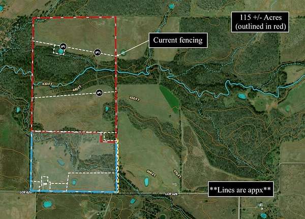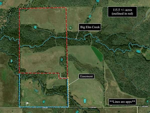 Center- appx 46 Acres:A scenic mix of mature timber and Big Hill Creek bottomland, enhanced by the presence of Big Elm Creek, which flows year-round through the property, adding tremendous value for livestock watering, wildlife, and overall beauty. Roughly 10 acres of this section have been recently cleared and planted in Sugar Graze Ultra, a high-performance hybrid Sorghum-Sudan grass.