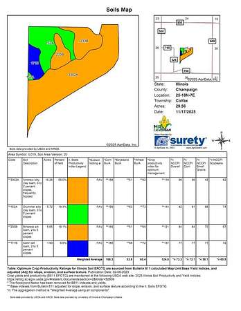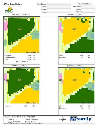 Est $2,519/mo+/- 30.50 acres in Colfax Township (approximately one mile northwest of Sadorus near Craw Cemetery). Class B soils with a 124.8 soil productivity index and approximately 29.56 tillable acres. Only the portion north of the drainage ditch is being sold from this parcel. Access is available at the northwest corner of the property. 2026 farming rights will be available.