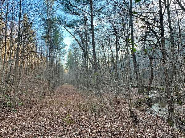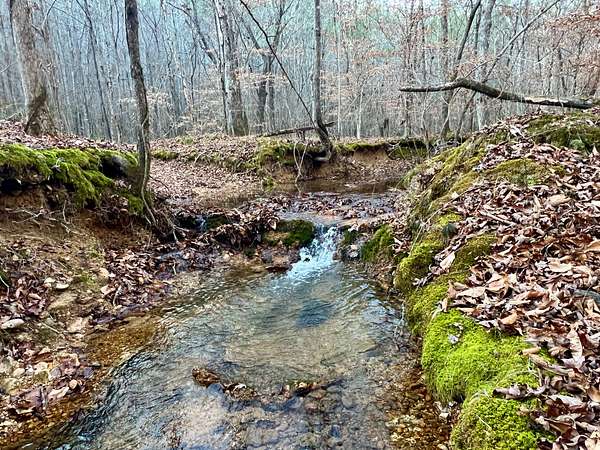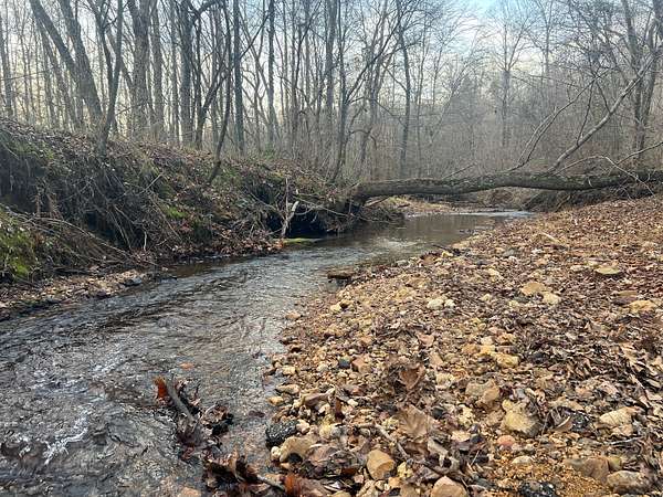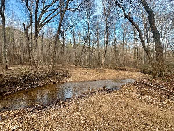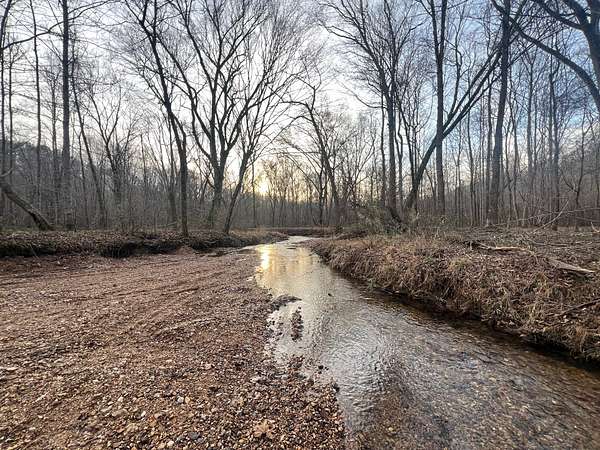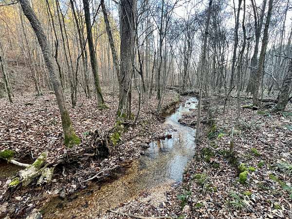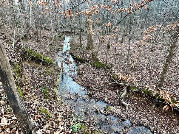 The property features two beautiful year-round creeks. Pigeon Branch forms almost the entire western boundary, winding through roughly 1.25 miles of hardwood bottoms. You can hear the creek flowing as you approach it, and the open hardwood floor makes it easy to walk along its twists and turns. Brush Creek, a larger rock-bottomed creek, cuts through the southern portion of the property and offers approximately 750 feet of private frontage on both sides. The seller recently mulched around this area, creating an open setting ideal for bowhunting or simply relaxing with family.