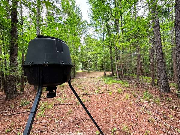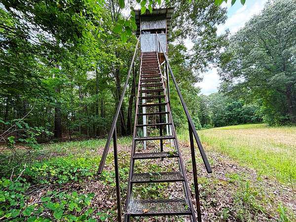 The land includes two established food plots with stands, mineral licks, and a strong population of deer and turkey, all set in a landscape of mature timber featuring oak, hickory, and large pine. The field edges are lined with sawtooth oaks, providing even more attraction for wildlife.