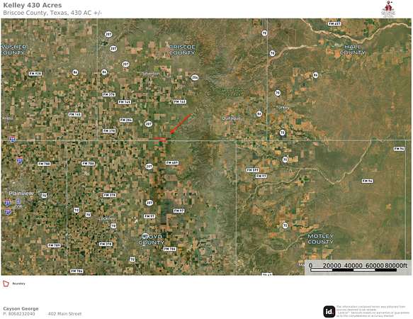 This property sits approximately 12 miles South of Silverton on the East side of Highway 207. Turn East on County Road A and the farm sits on the south side of the County Road at about a mile off of Hwy 207. The farm has County Road frontage along the Northern boundary. This farm is 25 miles from Floydada to the North, 76 miles from Lubbock, and 30 miles from Plainview. This property sits in Briscoe and Floyd Counties. 435 Acres Briscoe County, Texas This 435 acre tract in Briscoe County offers a rare opportunity to acquire a previously cultivated farm that has recently transitioned into improved grass production with long-term flexibility and income in place. Grass & Land Use Approximately 400 acres were planted to spring grass in 2025 through an NRCS EQIP program, establishing a solid foundation for future grazing and soil conservation. The remaining 35 acres consist of native grass. The property is currently enrolled in a grazing plan paying $18 per acre, with the income transferable to the new owner. The existing contract expires September 30, 2027, at which time the buyer will have the option to return the property to cultivation or continue operating it in grass. This structure provides immediate income with strategic flexibility. Water Improvements An EQIP application is pending for: One water well Two stock troughs Water line connecting the well to the troughs Anticipated well and water line locations are shown in the attached photos. Approval is expected in late April to May. If approved, this would significantly enhance the property's long-term grazing functionality and livestock capacity. Mineral Rights All owned mineral rights will convey with an acceptable offer. Soils- -381 Acres with Pullman clay loam, 0-1% slopes - 28 Acres with Pullman clay loam, 1 to 3% slopes - 9 Acres with Estacado clay loam, 1-3% slopes *Soil maps attached* Base Acres: Wheat Grain Sorgum Seed Cotton Hunting, Wildlife, and Recreation: The recreational opportunities of this property are predominately going to be Dove, Quail, Pheasant, Sandhill Crane, and Geese. There is a known Mule Deer & Whitetail herd in the area that produces some top class deer.