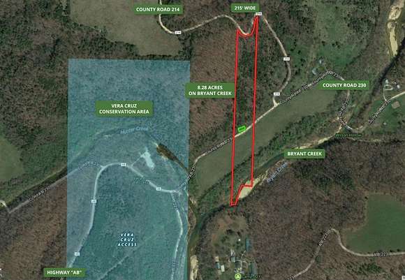 8.2 Acres on Bryant Creek - Douglas County, MO 'Check out this unique 8.2-acre property that has it all. Open fields, mature timber, & 200 ft of Bryant creek frontage. Whether you're looking for a fishing hole, hunting property, or a place to build your dream home, this place is for you. The options are endless. This property is located just down the road from the Vera Cruz Public Conservation Area. The conservation area features one of the best swimming holes around, campsites, & hunting all for public use. On the balance of the property, you'll find a historic 1920s-era rock building, once known as The Vera Cruz Store. Constructed from rubblestone or cobblestone, this landmark stands as a testament to the region's history, dating back to the Great Depression era. This would make a neat restoration project. Location: Near Vera Cruz Conservation Area, Douglas County, MO Acreage: 8.2 acres Features: Creek access, wooded land, open fields, hunting, camping Historic Site: 1920s-era rock store building Don't miss this opportunity to own a rare piece of Missouri history and nature!