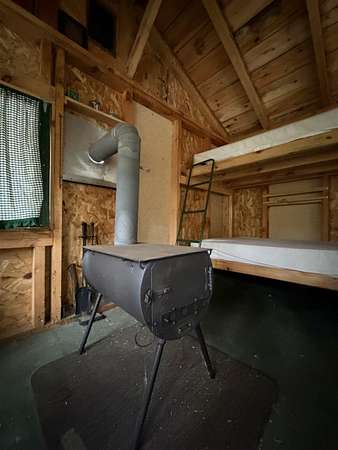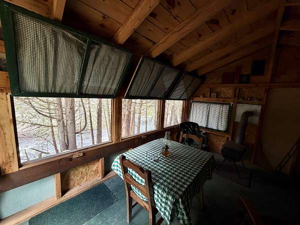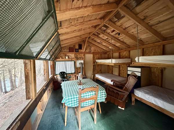 A charming meadow from the road, but so much more — just follow the sound of rushing water. On the far side of the meadow you’ll find a short path leading to a primitive cottage on a fragrant, cedar-lined ridge above a small waterfall. The cottage itself is only one room, yet it efficiently houses four single beds, a table and chairs, with room to spare. Open those windows and enjoy the soundscape without fear of mosquitoes. A second trail leads you down to a lower cleared area, which has tons of potential! Local lore has it that, as there is no dam between this property and the ocean, a well-timed fishing trip could land a lucky angler a salmon. This property is wonderful as is, but could also serve as a great spot to build your forever home.
