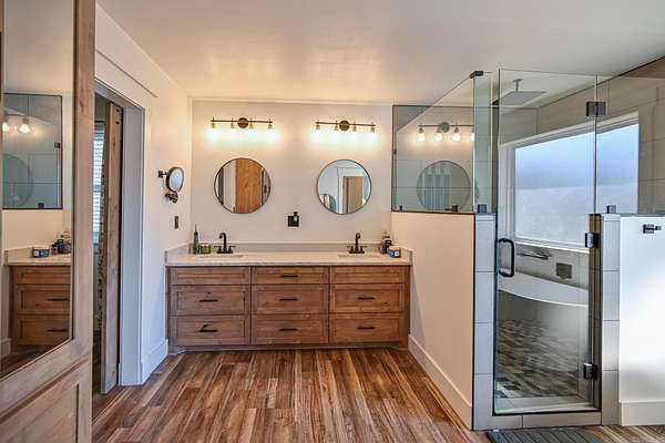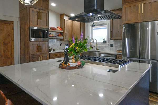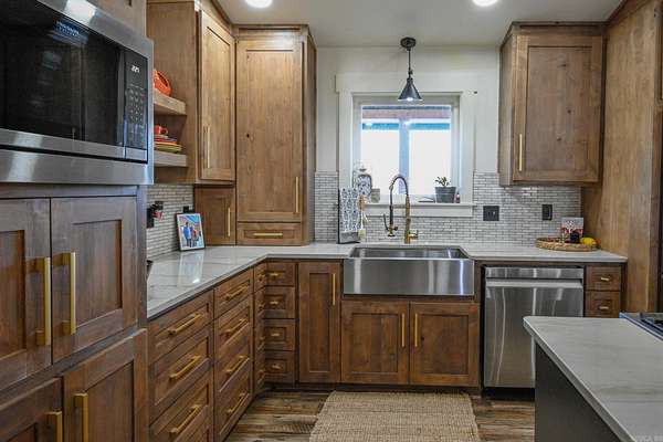 This stunning brick home offers the perfect blend of modern luxury & peaceful country living. Step inside to find quality craftsmanship throughout, including custom cabinetry w/pull-out storage. Quartz countertops in the kitchen, bathrooms & walk-in pantry. The open living area centers around a stunning stone, wood-burning fireplace. The kitchen features a 48" dual-fuel range & stainless-steel appliances. Both bedrooms offer spacious walk-in closets & each bathroom includes fully tiled showers, w/the primary suite boasting an impressive walk-in shower. Tankless gas water heater for efficiency. Gable covered 10x20 front porch with an expansive 8x60 gable covered back porch, and a 24x24 attached covered carport, all accented w/ Douglas Fir posts. The home is equipped w/electric, gas & wood-burning capabilities for versatile living. In addition to the main home, the property features a shop w/12-foot walls & spray foam insulation. Includes a fully operational kitchen, 2 bedrooms, bathroom w/custom tiled shower, washer/dryer hookup, water heater, custom shelving & 14 ft full-length awnings on both sides of shop. Two RV hookups & an 18x40 RV carport. Separate septic system from house.