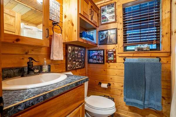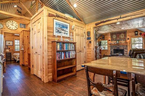 The cabin offers a warm and inviting living space featuring a wood-burning masonry fireplace, exposed heavy timber accents, log siding, and a durable metal roof. The primary bedroom includes a spacious loft area large enough for a king-sized bed, along with two additional storage lofts for added functionality. A whole-house reverse osmosis water filtration system enhances everyday comfort and convenience.