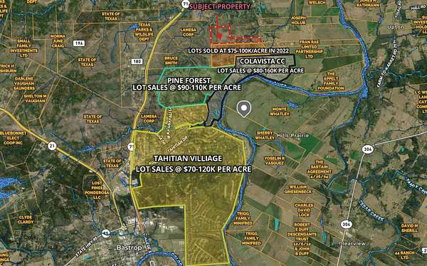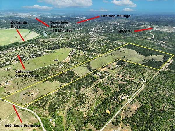 5% Down - Interest Only - Owner Financing This 142 acre tract, located just east of Tahitian Village, Pine Forest, and ColoVista Country Club, is a prime opportunity for residential development in the booming Bastrop County market. With just 5% down and interest-only owner financing available, this is an ideal chance for investors and developers looking for flexibility and favorable terms. With over 600 feet of paved frontage on Crafts Prairie Road and a 4-inch AQUA waterline already in place at the road, the property is development-ready. Rolling hills, a blend of old-growth and younger pine stands, and scattered mature oaks give the land natural texture and visual appeal. Most of the property enjoys sweeping 180+ degree views of the Colorado River Valley-an uncommon feature in the area that sets this tract apart. Its elevation and layout are ideal for a mix of 1-acre lots and larger estate tracts, with room for thoughtful design and privacy. Lot comps in nearby Tahitian Village, Pine Forest, and ColoVista Country Club range from $60K to $170K per acre, with this property's topography and views likely commanding prices toward the upper end of that spectrum. The land is less than 10 minutes to Bastrop, Smithville, and Buescher State Park, under 40 minutes to Tesla and ABIA, and just 50 minutes from downtown Austin. ColoVista's golf course, restaurant, and pool are only 1.5 miles away, making this location a strong fit for both full-time residents and second-home buyers alike. Whether you're planning a high-end community or a long-term investment with income potential, this property offers the access, infrastructure, and natural beauty to make it a success.