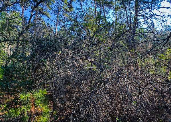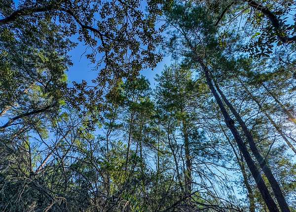 The land is generally flat with mixed pine trees and open grassy areas, creating a quiet environment.