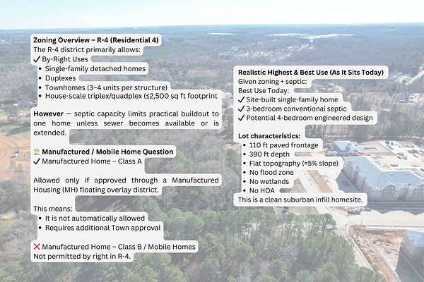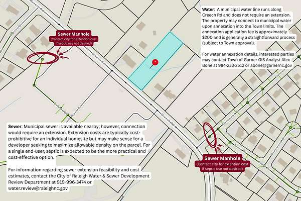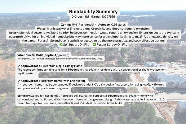 Build-ready 0.98-acre residential parcel located at 0 Creech Rd in Garner, Wake County, NC, offering an excellent opportunity in a rapidly growing area with no HOA restrictions. The property features R-4 zoning, and boasts approximately 110 feet of paved public road frontage, providing easy and direct access. The land is flat and level, making site planning and construction efficient and cost-effective. Lot supports one single-family home or one duplex. Lot does not qualify for subdivision due to width requirements. Flag lots are technically allowed, but are rarely approved. Public water is available at the road, and a recent soil evaluation supports a 3-bedroom standard septic system or a 4-bedroom pre-drip septic system. No wetlands and no FEMA flood zone impact the property, simplifying permitting and development. Municipal sewer is located nearby but would require extension for connection; extension costs are typically prohibitive for individual users. Septic is a viable and more cost-effective option. Surrounded by established residential neighborhoods and nearby new development, this parcel offers the ideal balance of privacy and convenience. Located just minutes from downtown Garner and a short drive to Raleigh, the property provides quick access to major highways, employment centers, shopping, dining, and healthcare. Coordinates Lat: 35.7327 Long: -78.6009 NEARBY MAJOR CITIES o Garner, NC - 3 miles o Raleigh, NC - 9 miles o Cary, NC - 17 miles o Durham, NC - 28 miles NEARBY MAJOR AIRPORTS o Raleigh-Durham International Airport (RDU) - 23 miles o Fayetteville Regional Airport (FAY) - 55 miles o Piedmont Triad International Airport (GSO) - 85 miles o Charlotte Douglas International Airport (CLT) - 150 miles NEARBY MAJOR ATTRACTIONS o Downtown Raleigh / Glenwood South - 9 miles o Lake Benson Park (Garner) - 4 miles o Pullen Park & NC State University - 10 miles o Jordan Lake State Recreation Area - 35 miles