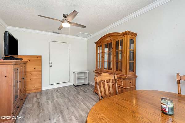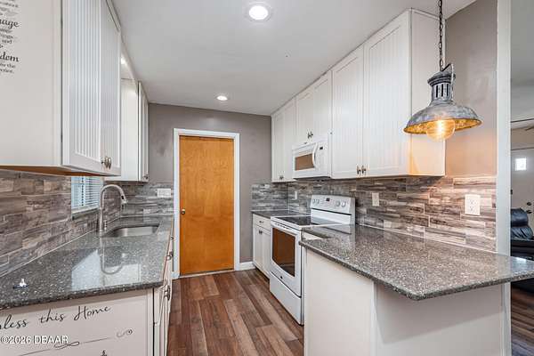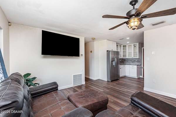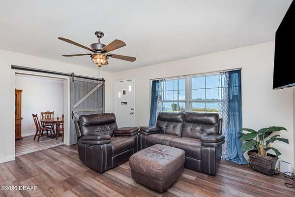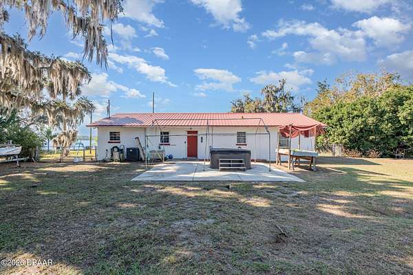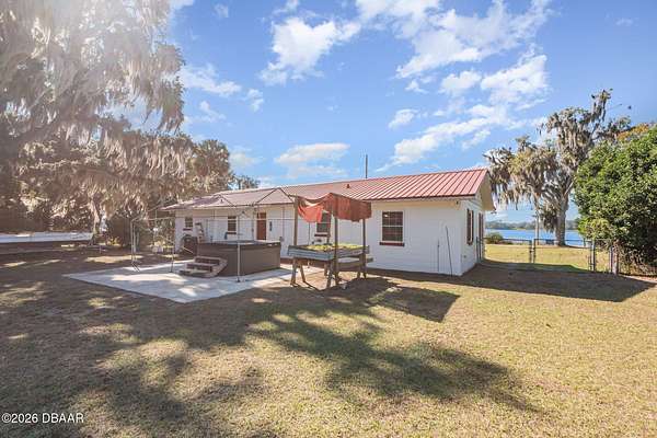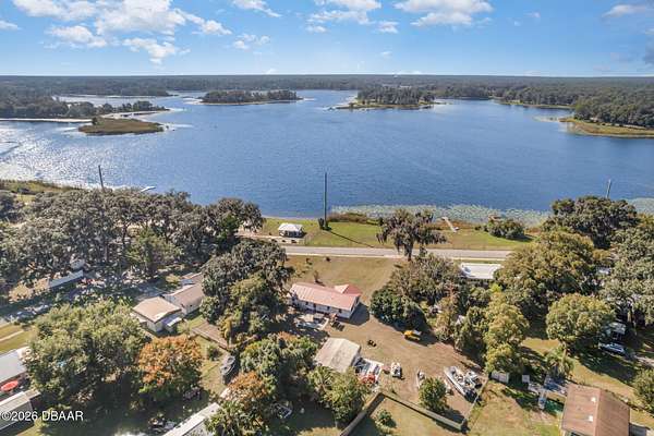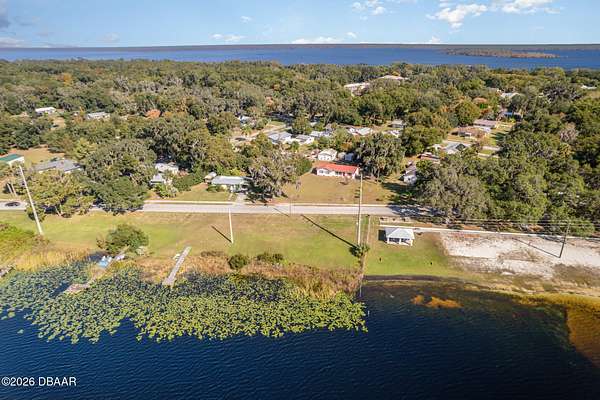 Waterfront paradise on 2 acres! Enjoy stunning sunsets from the comfort of your front porch overlooking Lake Stella. Lakefront living! This 3 BR/2 BA BLOCK home features its own PRIVATE dock and sits in the ''Bass Capital of the World.'' Located just 8 miles east of the St. Johns River, you'll love the small-town charm of this peaceful golf cart community, centrally positioned between Daytona, Ormond, DeLand, Ocala, and Astor. Home features include a metal roof (2021) with metal trusses, newer windows, and a new water heater (2023) and fresh paint. The updated kitchen offers soft-close cabinets & quartz countertops, and luxury vinyl plank flooring (2021) runs throughout the home. A spacious front yard offers plenty of room to relax, while the massive fully fenced backyard boasts citrus trees, a gazebo, and a large 24x30 detached garage perfect for boats, vehicles, and toys. Located near Dexter Beach, and nestled between Crescent Lake & Lake Stella.