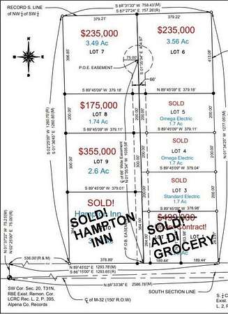 INFRASTRUCTURE COMPLETE! 11.39 ACRES with Municipal Water & Sewer, Natural Gas & Electric! A Huge Savings, situated in the fastest growing area of Alpena County on M-32, just 1.8 mile West of the popular M-32/Bagley St Corridor! Zoned B-2, high visibility, high traffic count & multiple traffic lanes. Front Lots are anchored by newly constructed Aldi's and under construction Hampton Inn. The Service Drive off M-32 (Crittenden Ct) accesses interior lots, with signage available for added visibility. Neighboring Business include Walmart, Meijer, Home Depot, McDonald's, Culver's, Applebee's, Walgreens, Biggby Coffee, Starbuck's, Marshalls, Auto Zone, PNC Bank and Well Care. Lots may be sold separately. See Documents Tabs for Site Layout & Pricing of lots. Additional property is obtainable.