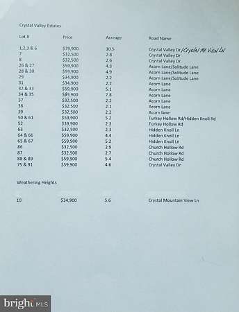 Est $436/moBEAUTIFUL CRYSTAL VALLEY ESTATES! Rurally located in the heart of Hampshire Co. just four miles north of Romney. This "wild life refuge" and older development sits on the east side of what is locally known as Herriots Mountain. A mixture of sloping to gently rolling lots, all wooded with various potential build sites. Well maintained country roads throughout. Only minutes from public access to the South Branch River. Also nearby is Crystal Valley Ranch Restaurant (horse stables and riding trails)...Double lot #75 & 91, 4.6 acres along Crystal Valley Dr....Build that home or getaway cabin!!! Other lots available, see plats and lot list...