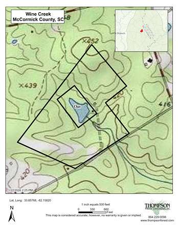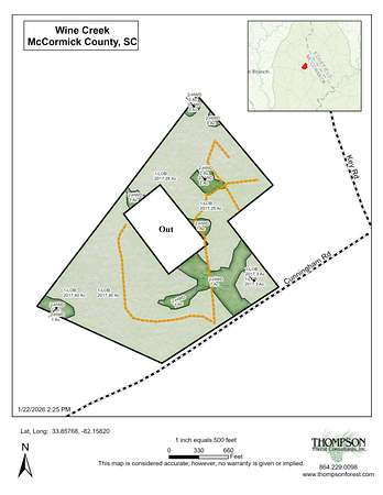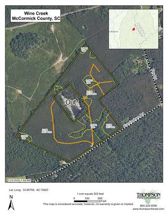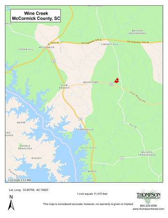 Investment, Recreation and Relaxation. Wine Creek is perfect for your dream house, hobby farm or hunting retreat. Uniquely situated, Wine Creek offers gentle terrain, abundant wildlife and easy access to the diverse outdoor recreational opportunities found in the area. The Long Cane Ranger district of Sumter National Forest, located just across the street, consists of 120,000 acres of hiking, mountain biking, equestrian, shooting sports, hunting and fishing opportunities. Clarks Hill Lake, the third largest lake east of the Mississippi, is just a short drive away. Clarks Hill has everything you love about the lake without the crowd. Wine Creek also has over 1,400ft of frontage on Cunningham Rd. and a good internal road system setup for UTV's. - 14 mins to Plum Branch Yacht Club - 15 mins to McCormick - 21 mins to Savannah Lakes. - 40 mins to Evans, GA The in-holding is accessed via a 20ft easement. Deer stands do not transfer with the property.