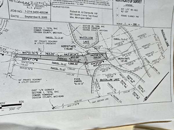 PARC C-4-2 & COM AT E 1/4 COR OF SEC 1, T27N R4E, TH N 1810.35' TO MCCOLLUMLAKE, TH N 65 DEG W 1564.41' TO POB, TH S 50 DEG W 1288.20' TO RD, TH N 32 DEG W 50' ALG RD, TH N 47 DEG E 763', TH N 43 DEG E 452', TH N 25 DEG E 116.65', TH N 42 DEG E 350.50',