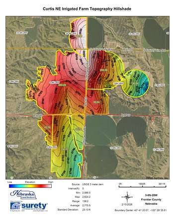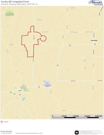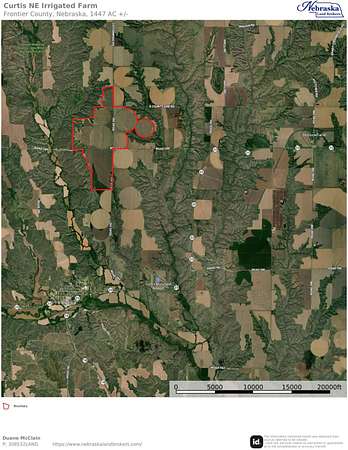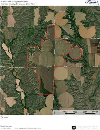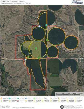 CURTIS NE IRRIGATED FARM A rare and very nice irrigated farm opportunity located in northern Frontier County, NE with 1,141 Middle Republican NRD Certified irrigated acres on very productive cropland soils. Highlights of this opportunity include: 1,447 taxed acres to be surveyed 751.38 Middle Republican NRD certified irrigated acres under pivot 389.62 Middle Republican NRD certified irrigated acres for gravity irrigation Nearly all cropland is Class I and II Hall silt loams with 1 - 3% slopes Electric powered wells with good water availability Very good county gravel road access Multiple producers in the area for the Investor Buyer Multiple commodity marketing opportunities 200,000 bushel of grain storage This pivot irrigated farm is located in a very competitive area for high quality cropland acres. All 4 irrigation wells are in good condition. Details of each well is available below. This farm includes 4 very good irrigation wells that are piped together with buried water lines. The 4 wells service 7 Valley center pivots and the gravity irrigated cropland. Because of the complexity of the irrigation systems, the farm is not conducive to being divided for marketing. It is being offered as one very nice irrigated farm and if multiple Buyers can make an acceptable offer to the Seller and work together after closing to divide the farm that is their option to do so. Commodity marketing opportunities in the region include 3 different ethanol production plants, cattle feeding capacity of over 200,000 head and multiple grain delivery stations. The farm is leased out for the 2026 growing season. A Buyer may negotiate with the Seller to determine '26 rental income proration. Frontier Lincoln Farm includes approximately 1,447 taxed acres contingent upon a survey in Frontier and Lincoln County. The farm has very good access on Cottonwood Road aka Road 393, County Road 749 and County Line Road. The land use acreage breakdown includes: Pivot Irrigated Cropland: 751.38 acres Gravity Irrigated Cropland: 389.62 acres Non-Irrigated Cropland: 137 acres Unfenced Rangeland: 136 acres Building Sites: 10 acres Roads and Waste: 22 acres The center pivot irrigated cropland in watered with modern Valley 8000 systems. 5 of which were put in in 2002 and 2 in 2015. The details of each pivot is listed below. Each of the 4 electric powered irrigation wells include 200 hp electric motors and are connected together with buried water lines. The wells provide irrigation water for the center pivots and the gravity irrigation gated pipe. There is a large inventory of line and gated pipe that sells with the farm. There is about 300 acres of gravity irrigated cropland in Section 9 of the farm. This is watered mostly by Well #4 but can receive water from Well #2. The balance of the gravity irrigated cropland is intermixed within the pivot irrigated. The non-irrigated cropland is intermixed within the irrigated cropland. The very productive cropland soils on this farm is 92% Class I and II Hall silt loams with 1 - 3% slopes. There are 2 stock tanks on the farm that provide stock water for stalk grazing. There is a large amount of unfenced rangeland that can be grazed as off season range with the stalks. ACRES: 1,447 +/- taxed accessed acres to be surveyed LOCATION: Farm is located about 4 miles northeast of Curtis, NE in northern Frontier County. small portion of the farm is in Lincoln County. LEGAL DESCRIPTION: Township 8 North - Range 28 West of the 6th P.M., Frontier County, NE. Section 3: Tract to be surveyed 270+/- taxed acres Section 4: S1/2NW1/4; SW1/4; E1/2 580.09 taxed acres Section 9: E1/2; PT NW1/4 379.13 taxed acres Township 9 North - Range 28 West of the 6th P.M., Lincoln County, NE. Section 34: Tract to be surveyed 82+/- taxed acres FSA BASE INFORMATION: Farm is enrolled in PLC with 1,171 acres of FSA cropland base. 698.9 acres corn base with 167 bushel yield and 250 acres corn base with 159 bushel yield. 194.20 acres wheat base with 65 bushel yield and 19.40 acres wheat base with 47 bushel yield. 12.30 acres of grain sorghum base with 41 bushel yield and 3.20 acres of oats base with 41 bushel yield. REAL ESTATE TAXES: 2025 taxes due in 2026 are being calculated. MIDDLE REPUBLICAN NRD OCCUPATION TAXES: $12,551.00