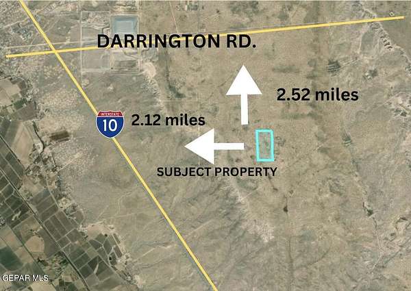 Est $1,675/moLARGE 80 ACRE PARCEL OF LAND LOCATED CLOSE TO I-10 AND DARRINGTON. EXCELLENT LONG-TERM POTENTIAL AS EL PASO CONTINUES TO GROW AND EXPAND ALL THE WAY TO FABENS. IT IS ALWAYS A GREAT TIME TO INVEST IN UNDEVELOPED LAND IN EL PASO COUNTY AS IT CONTINUES TO GROW AND EXPAND. LOCATED ABOUT 2 MILES FROM I-10, 2 MILES FROM DARRINGTON, AND 2.5 MILES FROM CATTLEMAN'S STEAKHOUSE. TAKE THIS OPPORTUNITY TO OWN YOUR OWN PIECE OF TEXAS.