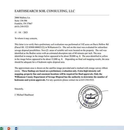 Est $2,366/moFive beautiful wooded acres with a natural spring on the property. Build your dream home in the area country music stars call home. Walking distance to the Natchez Trace. Preliminary Soil Report attached in the Documents Section of this listing indicates it should be adequate for a 4 bedroom septic disposal area.
