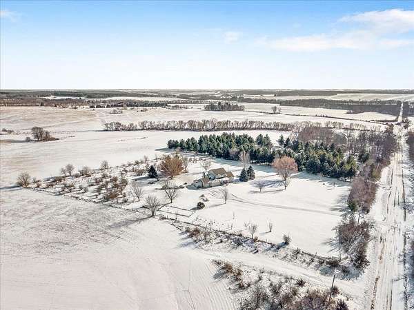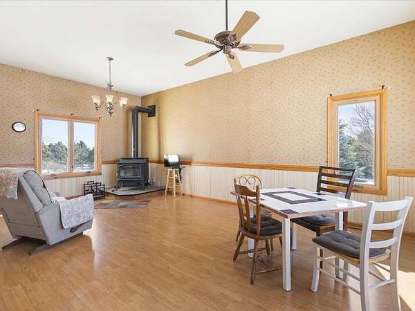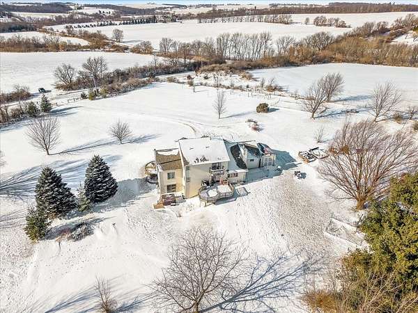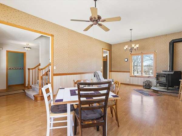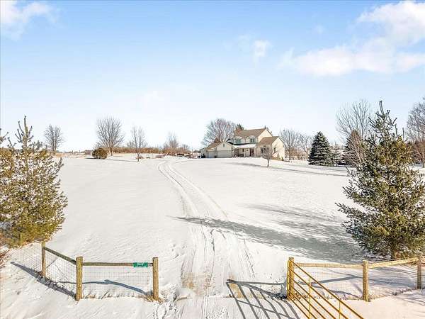 Enjoy true country living on this stunning 5-ACRE hilltop retreat with PANORAMIC views in every direction! A welcoming covered front porch sets the tone as you enter the home, featuring a large open foyer and soaring 10-foot ceilings in the formal living and dining rooms. The kitchen offers a built-in pantry and breakfast bar, perfect for everyday living and entertaining. Cozy up in the family room with a wood-burning fireplace with brick surround and gas start, while an additional wood-burning stove in the formal living/dining area efficiently heats the home. A spacious main-floor laundry/mudroom adds everyday convenience. The primary suite is a private retreat with a walk-out balcony, full bath with jetted tub, and step-in shower. Step outside to enjoy the composite two-tier deck or relax in the hot tub on the walk-out lower-level patio. The walk-out basement is ready for finishing, offering potential for an additional bedroom, family room, and bathroom (already roughed in). Outside, the FULLY FENCED 5 acres provide endless possibilities, complete with walking paths, a 10x16 garden shed, chicken coop, and an impressive variety of plantings including 16 Edelweiss and Concord grapevines, raspberry, strawberry, and blackberry patches, plus 10 fruit trees (cherry, apple, plum, pear, and peach). Additional highlights include a 3-CAR GARAGE, NEW roof, all NEW windows and sliding doors (2024-2025), NEW well pump (2024), NEW water heater (2025), high-end Kinetico water softener, and metal Rolodon security shutters on select windows and sliders. This is a rare opportunity to enjoy privacy, space, and peaceful country living--your own country paradise awaits!