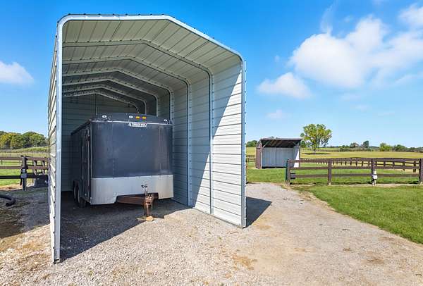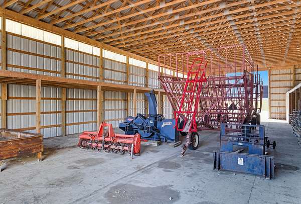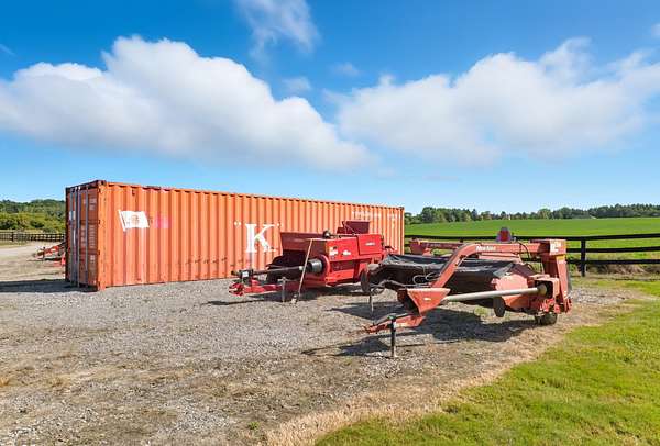 The equipment barn is 50 x 26 with 3 doors. Carport storage is 30 x 30. All of the tractors and hay equipment are in great condition and stored inside. Also included is a storage container for fencing and misc.