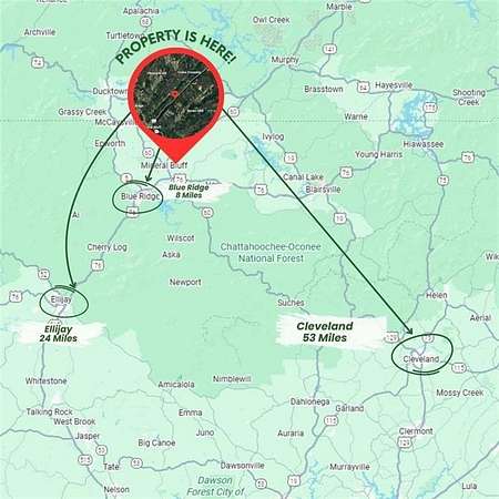 Coordinance is 34.929909, -84.260431 From Blue Ridge Georgia 30513 Head northeast on E 1st St/Old Hwy 76/Old U.S. 76 toward Depot St 1.1 mi Turn left after Pizza Hut (on the left) 0.1 mi Turn right onto US-76 E 3.2 mi Turn left onto GA-60 N 1.9 mi Turn right onto GA-60Spur 1.6 mi Turn