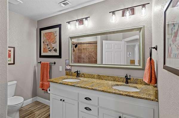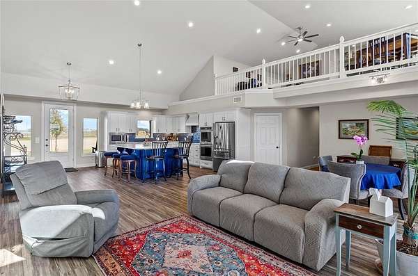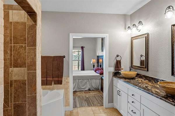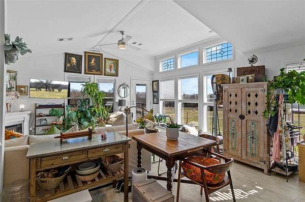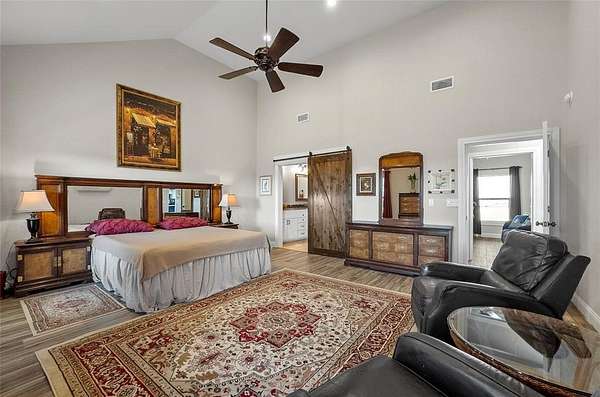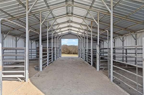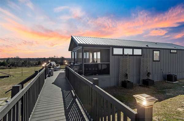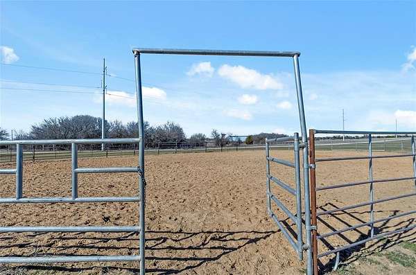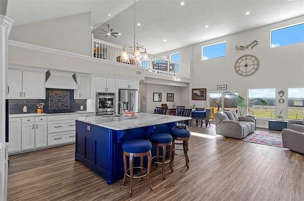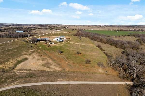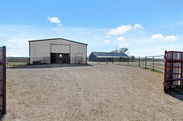LUXURY FARM & RANCH ESTATE - TWO HOMES ON 33 ACRES! Experience unparalleled beauty and functionality on this private 33-acre estate, where upscale meets Texas ranch living. Thoughtfully designed & fully renovated in 2016, this fully fenced & cross-fenced property is ideal for livestock, with three barns accommodating animals, feed, tack, & workshop space. The main home, a 3,169 sq. ft. custom ranch style, offers 3 bedrooms, & 3 full baths, with a split-bedroom floorplan & exquisite high-end finishes throughout. Soaring ceilings & wood-look tile floors set the stage for the open-concept great room, where expansive windows capture breathtaking panoramic views & steller sunsets. The gourmet kitchen is a chef's dream, boasting a massive island, dual sinks, granite countertops, and abundant storage. A dedicated office and an oversized upstairs loft provide flexible space for homeschooling, work, or play. The primary suite is a private retreat, easily accommodating a king-size bed & sitting area, with a spa-inspired ensuite featuring a soaker tub, tiled shower, dual vanities, & a walk-in closet. The East wing includes two additional bedrooms, a dual-sink full bath, a mudroom with quartz counters, sink, and a laundry room. A partially finished basement adds storm shelter space & additional storage.