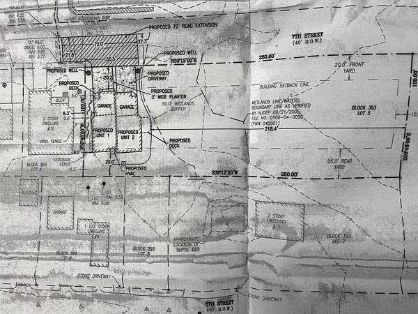 Large parcel measuring 280 feet in width and 100 feet in depth. WE have a copy of a 9-12-2008 Final Construction Plan, Variation Plan by Dante Guzzi Engineering for a Duplex with wetland buffers of 50 feet. See attached C Variance Resolution that passed. The buyer will be responsible for obtaining all necessary approvals, and the property will be sold in its current condition (AS-IS). The property is situated in Middle Township RC zoning. Images are for marketing purposes only, and the buyer should independently verify all lot lines and measurements. The seller and agent do not guarantee the accuracy of the information provided, and it is advised that the buyer and buyer's agent conduct their own due diligence. In 2008 was approved for a duplex and you need to extend the street 72 feet see associated docs. This was prior to city water coming in. This area, a long time ago, was once a small part the former Green Creek Training area. as is