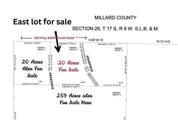 20 acres of raw ground, located along the old Hwy 6 & 50 (2500 South Delta). Use for camping, ATV riding, recreational, residential, etc. Gravel road frontage, septic feasibility study and septic system design complete. Property is surveyed and staked. Buyer can apply for 1 acre foot of underground water right with the State of Utah, so a well can be drilled. Buyer to verify with the Division of Water Rights. To access: Take Hwy 6&50 west from Hinckley Station, 6.8 miles, turn north onto Old Hwy (gravel road), follow that road west for an additional 5.8 miles to the west side of the access road leading back to the 259 acres to the south. Additional 20 acres available to the west and 259 acres available to the south. Zone Range & Forest, please contact Millard County Planner for specific questions on commercial uses, etc. No utilities nearby. Taxes are estimated and will be updated by the county in 2026.