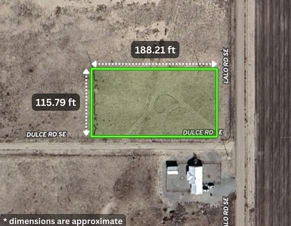 The property consists of three contiguous parcels (0.54, 0.54, and 0.50 acres) sold together, creating a larger footprint with dual access from both Dulce Road SE and Lalo Road SE, county-maintained dirt routes providing year-round access under normal conditions. The very flat grassland with scattered vegetation at approximately 4,150 feet elevation offers straightforward site planning with clear entry points from two sides.