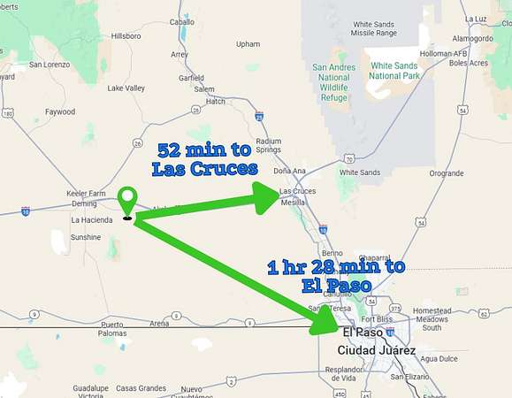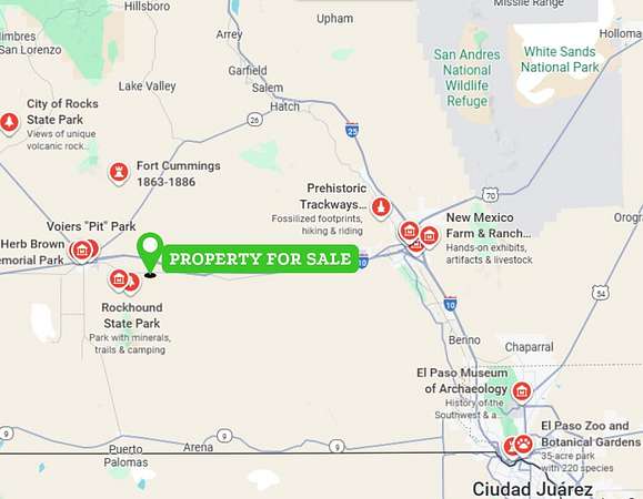 Southwestern New Mexico's dry climate, wide-open land, and lower population density appeal to those seeking desert living with essential services nearby. The region offers outdoor recreation including Rockhound State Park, Basin Range Geolapidary Museum, and desert exploration opportunities. El Paso, Texas sits approximately 1.5 hours away for expanded metro amenities, international airport access, and healthcare options.