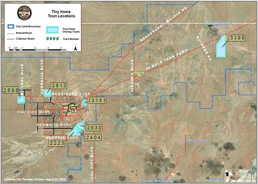 Est $1,510/moLocated in the states first Tiny & Small Home Overlay District (R-THO), this potential Planned Community is near the core of the first community, near Hacienda Elementary and California City Middle School. This unique 15 acre parcel is surrounded by three City streets connecting to Desert Butte Blvd. The City Water system along the streets already exists. A Professional Survey has been completed in 2021. Great for developer to plan a future subdivision of Tiny & Small homes, per ordinance. Developer's Tiny Pony Plan 465 is approved as is Developer's Smaller Modern Rustic Plan 847 (with engineered loft). Both are available for purchase.