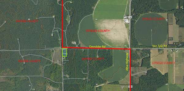 4.53 acres located just west of the Otsego & Antrim county line on Devolder Rd (just west of Alba Highway/Van Tyle Rd. The property is flat and wooded consisting of mostly pine. A driveway is already in place, maintained by the gas company. There are lots of options here as Star township has no zoning ordinances. Clear a spot and setup camp. Call for your private tour.